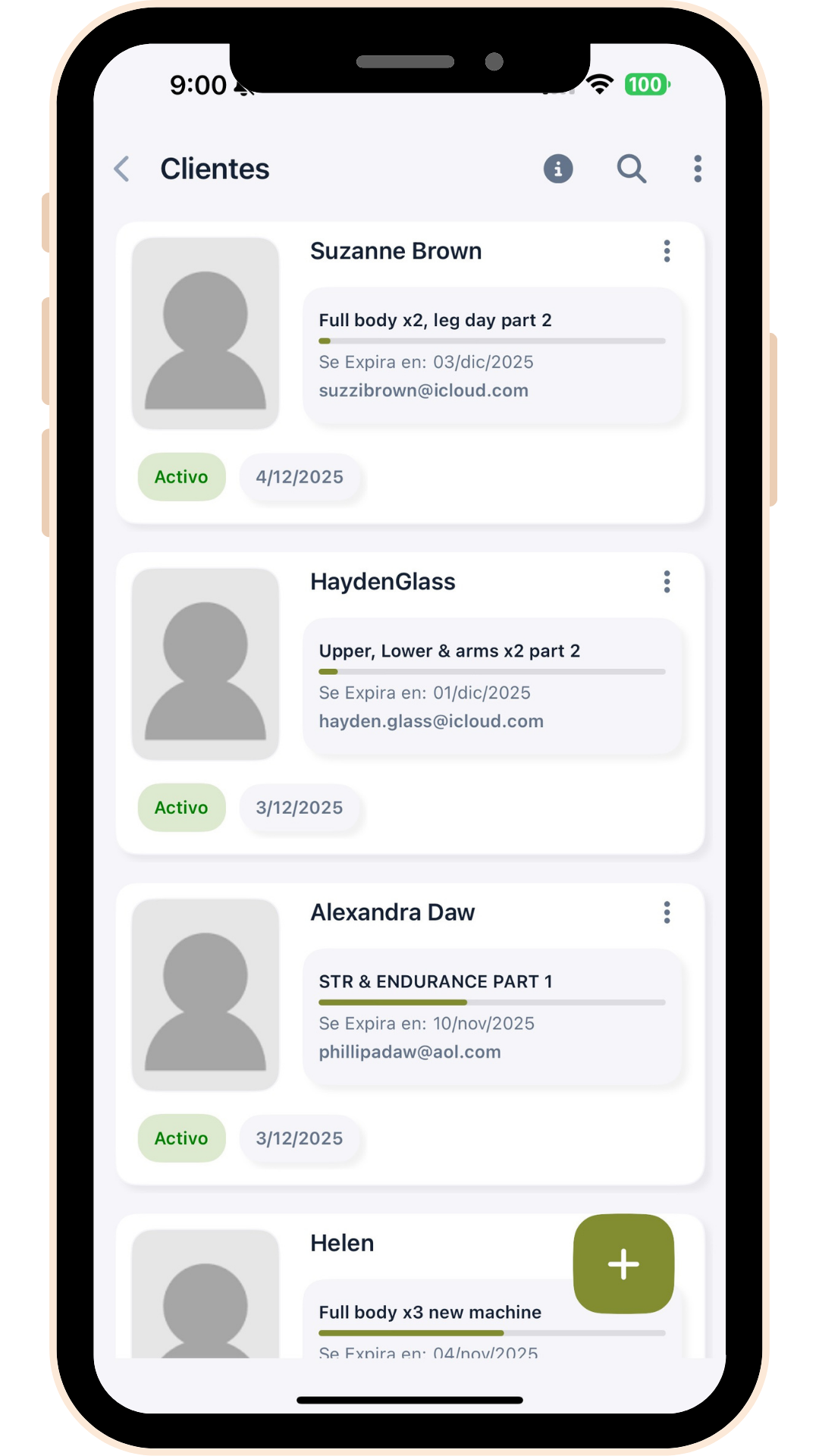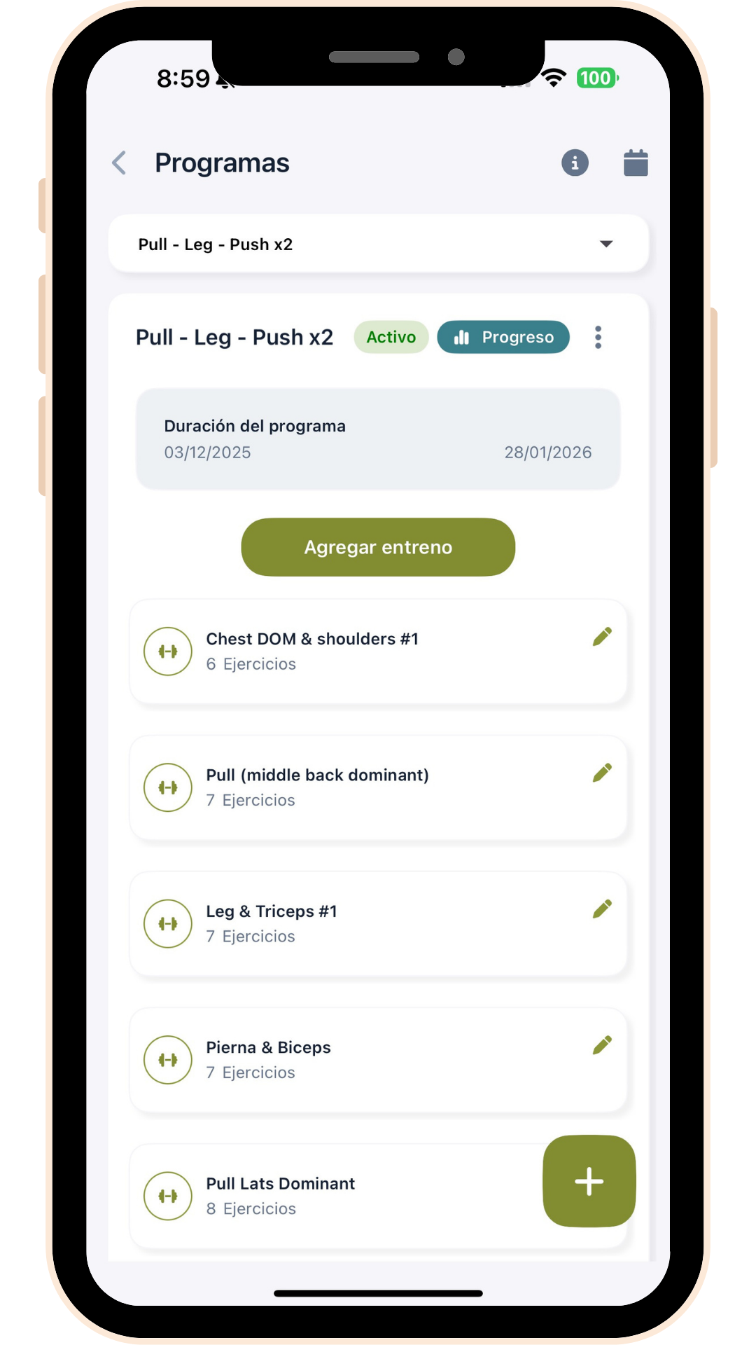 Planifica, organiza y registra ciclos de entrenamiento pasados y futuros para optimizar el progreso y el rendimiento de tus clientes.